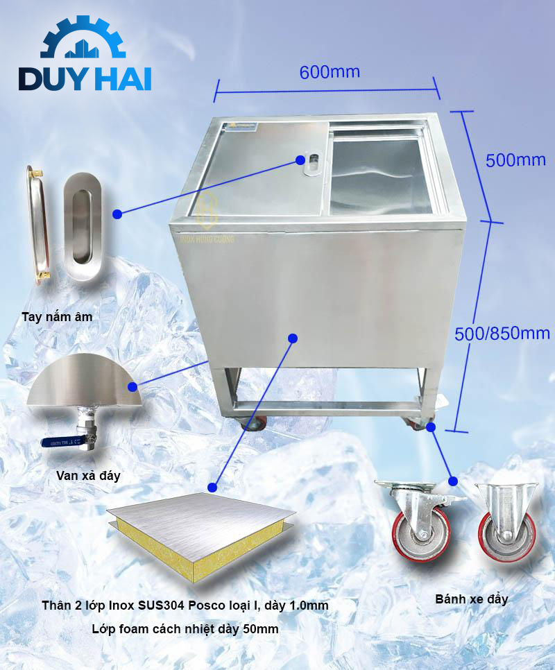 - Cấu trúc: Gồm hai lớp inox dày 1mm và lớp foam cách nhiệt dày 50mm, giúp giữ lạnh lâu hơn, giảm chi phí mua đá.
